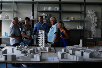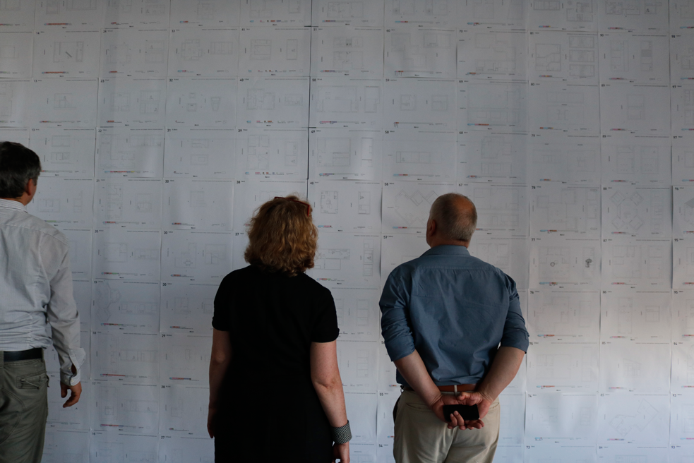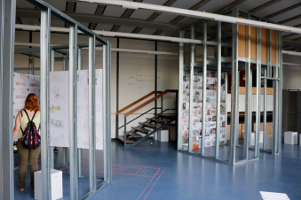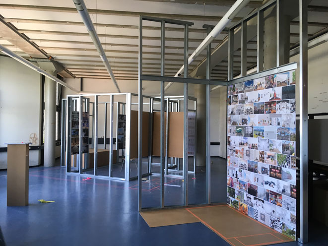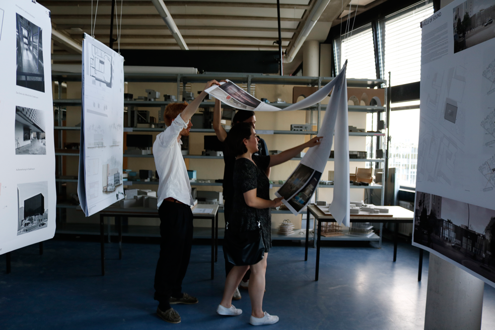 Erster ThemenBereich: der prozess Die Ausstellung im großen Studio zeigt den prozess der Entwurfsarbeit, der hinter den fertig gelayouteten Präsentationsplänen und den sauber gebauten Abgabemodellen steckt.